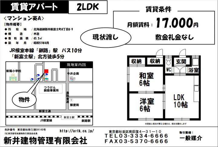 | 物件名 | 釧路市新富士町4丁目8-9 マンション英A 2LDK 17,000円 |