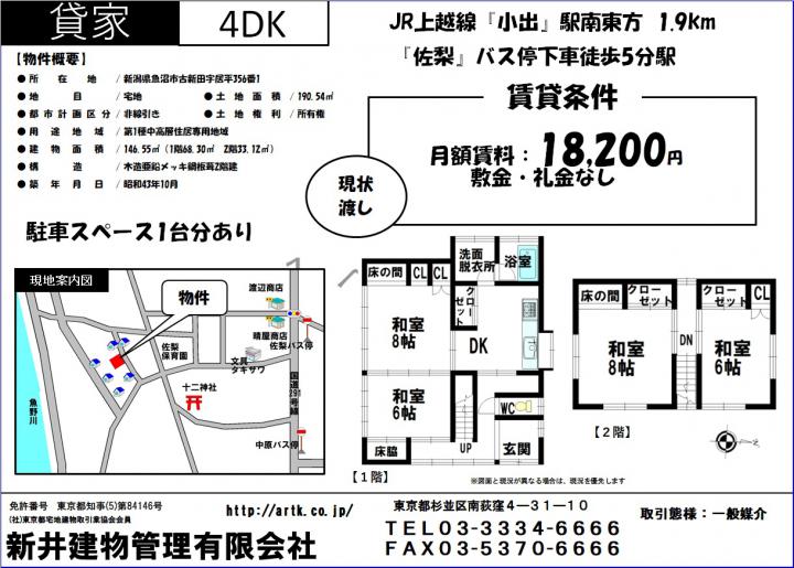 | 物件名 | 新潟県魚沼市古新田356-1 4DK 18,200円 |