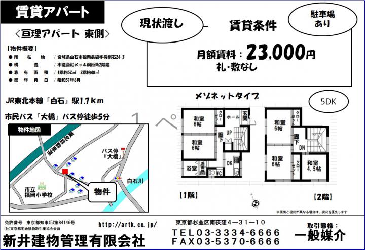 JR東北本線『白石』駅 1.7km | 白石市福岡長袋字将棋石24-3 東側1F2F | 5 DK | 100㎡(1階52㎡ 2階48㎡) | 1976年06月 | 23,000円 | なし なし |