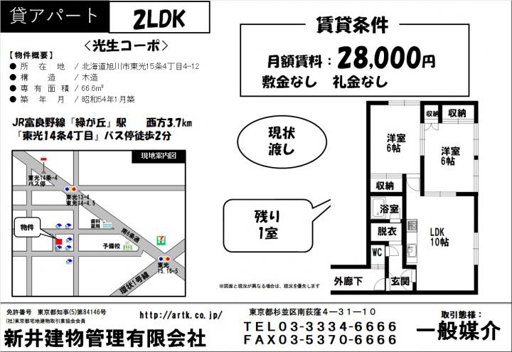 | 物件名 | 旭川市東光15条4丁目4-12 光生コーポ 2LDK 28,000円 |