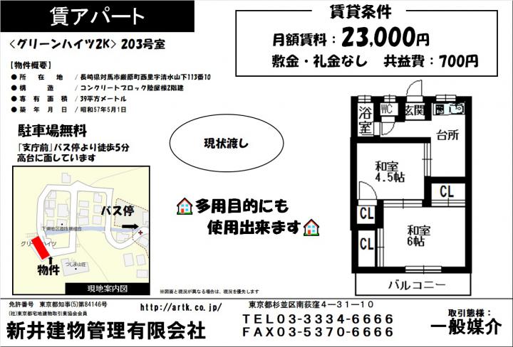 | 物件名 | 対馬市厳原町西里113-10グリーンハイツ203 2K 23,000円 |
