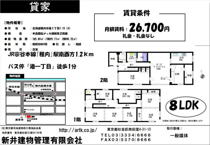 | 物件名 | 稚内市港1丁目1-15 A棟 8LDK 26,700円 |