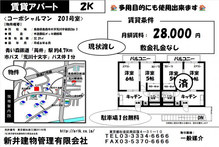 | 物件名 | 青森市大字荒川字柴田286-3コーポシャルマン 201 2K 28,000円 |