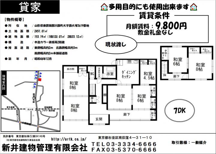 | 物件名 | 山形県東置賜郡川西町大字西大塚3619番地 7DK 9,800円 |