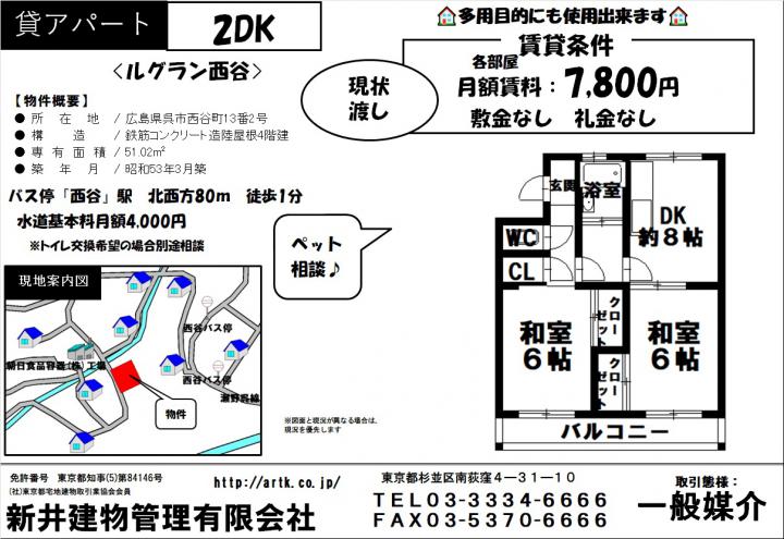 | 物件名 | 広島県呉市西谷町13-2 ルグラン西谷 2DK 7,800円 |
