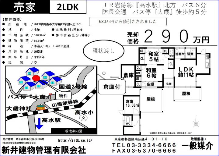 周南市大字樋口豊ヶ迫1101-2 倉庫付 2LDK 290万円 290万円/ 2 LDK JR岩徳線『高水駅』北方 バス 6分 防長交通 バス停『大歳』 徒歩 5分 周南市大字樋口豊ヶ迫1101-2 倉庫付 2LDK 290万円 |