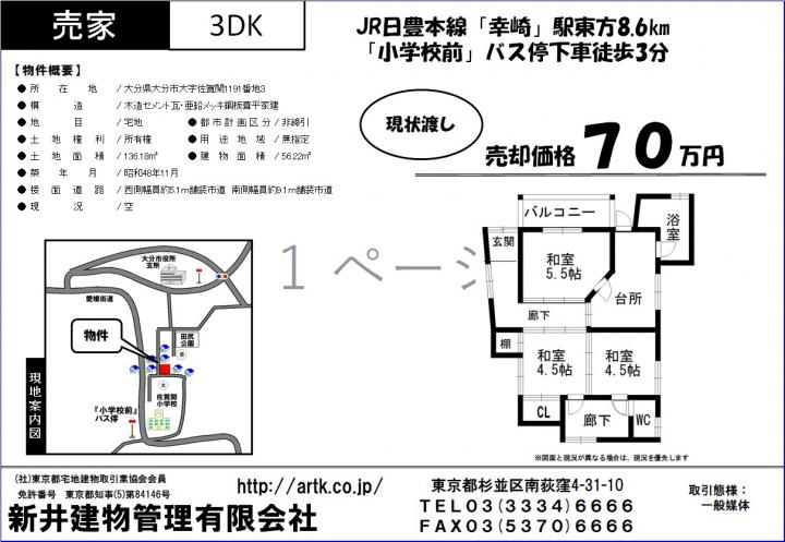 | 物件名 | 大分市大字佐賀関1191-3 3DK 70万円 |