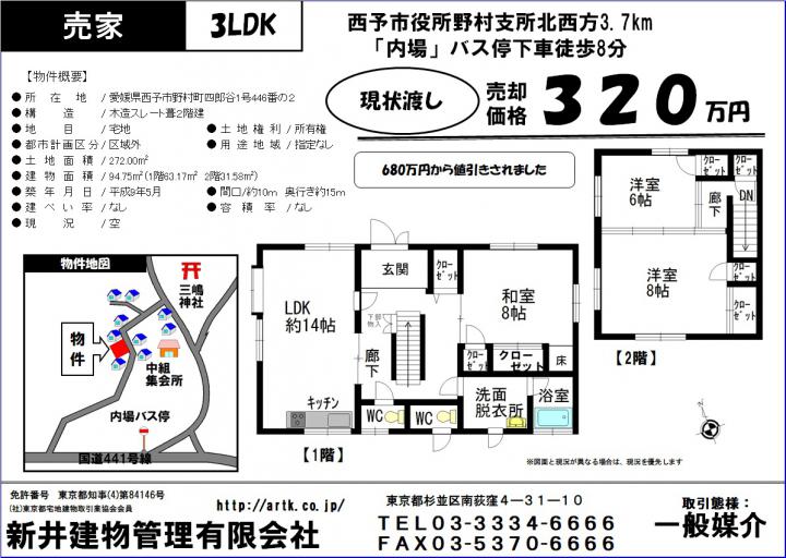 西予市役所野村支所北西方3.7㎞ バス停「内場」徒歩8分 | 西予市野村町四郎谷1号446-2 | 土地/272.00㎡ 建物/94.75㎡ | 1997年05月 | 320万円 | 3 LDK |