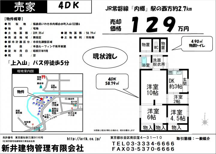 JR常磐線『内郷』駅 西方約2.7㎞ | いわき市内郷白水町入山122番6 | 土地/209.35㎡ 建物/58.79㎡ | 1956年09月 | 129万円 | 4 DK |