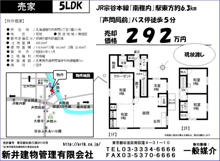 | 物件名 | 稚内市声問3丁目7番31号 5LDK 360万 |