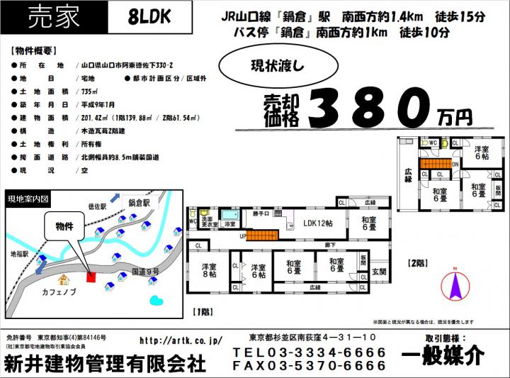 JR山口線『鍋倉』南西方約1.4km 徒歩 15分 | 山口市阿東徳佐下330-2 | 専有面積/201.42㎡(1階139.88㎡/2階61.54㎡) 土地/735㎡ 建物/201.42㎡(1階139.88㎡/2階61.54㎡) | 1998年01月 | 268万円 | 5 LDK |