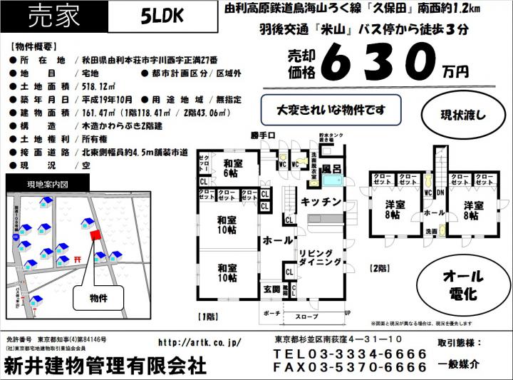 | 物件名 | 由利本荘市川西字正満27番 5LDK 630万円 |