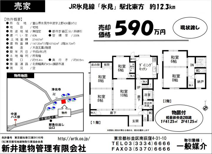 | 物件名 | 氷見市中波上野436-3-2 6LDK 590万円 |