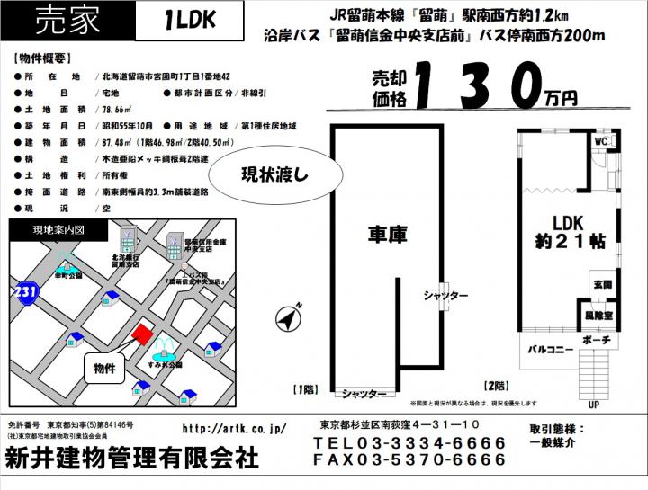 JR留萌本線『留萌』駅南西方約1.2㎞ 徒歩 15分 | 留萌市宮園町1丁目1番地42 | 土地/78.66㎡ 建物/87.48㎡(1階46.98㎡/2階40.50㎡) | 1980年10月 | 130万円 | 1 LDK |