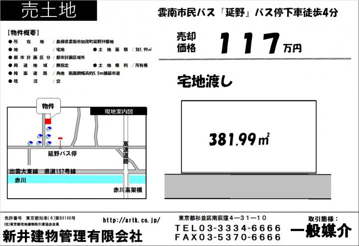 雲南市民バス『延野』バス停 徒歩 4分 | 雲南市加茂町延野59番 | 土地/381.99㎡ | 117万円 |