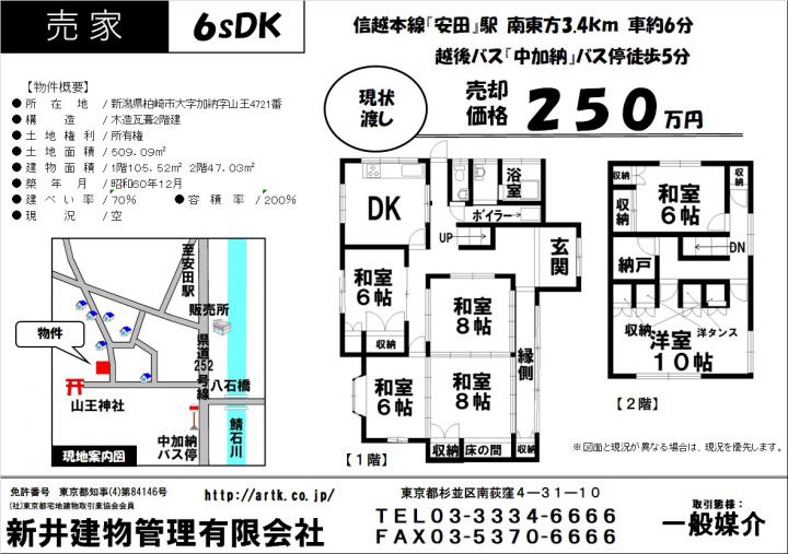 JR信越本線『安田』駅 南東方約3.4km 車 6分 | 柏崎市大字加納字山王4721 | 専有面積/152.55㎡(1階105.52㎡ 2階47.03㎡) 土地/209.55㎡ 建物/152.55㎡(1階105.52㎡ 2階47.03㎡) | 1985年12月 | 250万円 | 5 SDK |