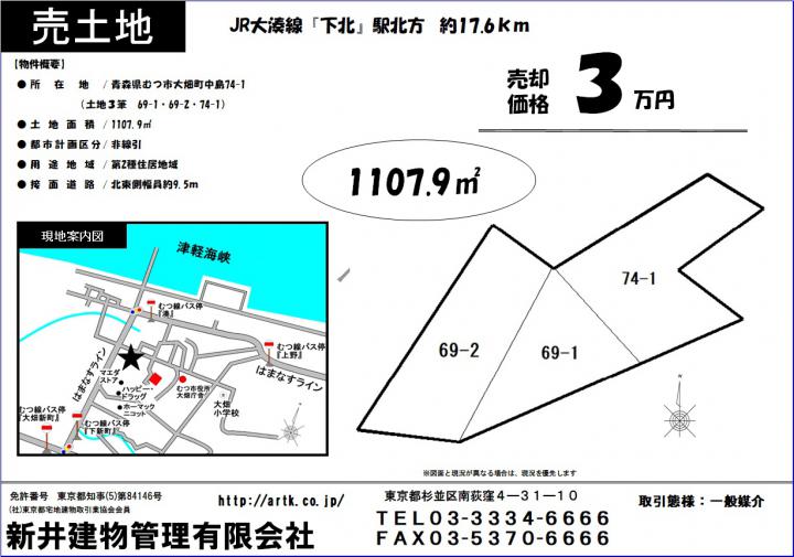 JR大湊線『下北』駅 北方約17.6km | むつ市大畑町中島74-1 | 土地/1107.9㎡ | 3万円 |