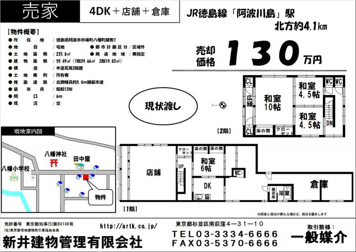 JR徳島線『阿波川島』駅北方 約4.1km 車 13分 | 阿波市市場町八幡町屋敷7 | 土地/235.8㎡ 建物/59.49㎡ | 1938年01月 | 130万円 | 4 DK |