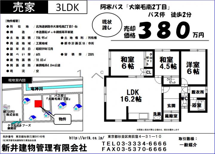 | 物件名 | 北海道釧路市大楽毛南2丁目1-46 3LDK 380万円 |