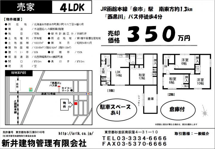 【 一戸建て 】余市郡余市町黒川町十六丁目14番10号 4LDK 350万