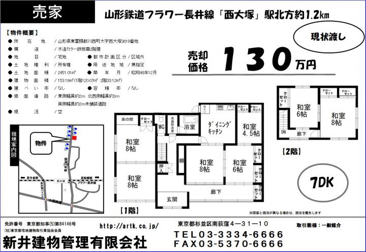 | 物件名 | 東置賜郡川西町大字西大塚3619 7DK 130万円 |