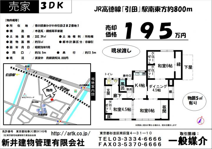 JR高徳線『引出』駅 南方約800m | 東かがわ市引田282-1 | 土地/202.39㎡ 建物/70㎡ | 1963-09 | 195万円 | 3 DK |