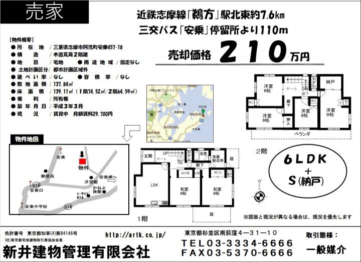 【不動産投資】志摩市阿児町安乗457-18 6SLDK 210万円(一戸建て)|210|近鉄志摩線『鵜方』駅北東約7.6km|新井建物管理|全国の不動産、収益物件、中古住宅、賃貸・売買物件