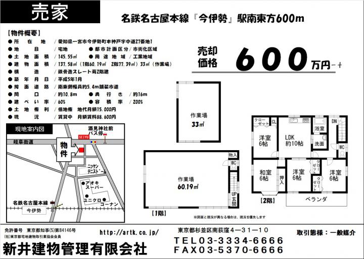 名鉄名古屋本線『今伊勢』駅 南東方 約600m | 一宮市今伊勢町本神戸字中道27-1 | 土地/145.55㎡ 建物/137.58㎡(1階60.19㎡ 2階77.39㎡) | 1993-01 | 600万円 | 5~ SLDK |