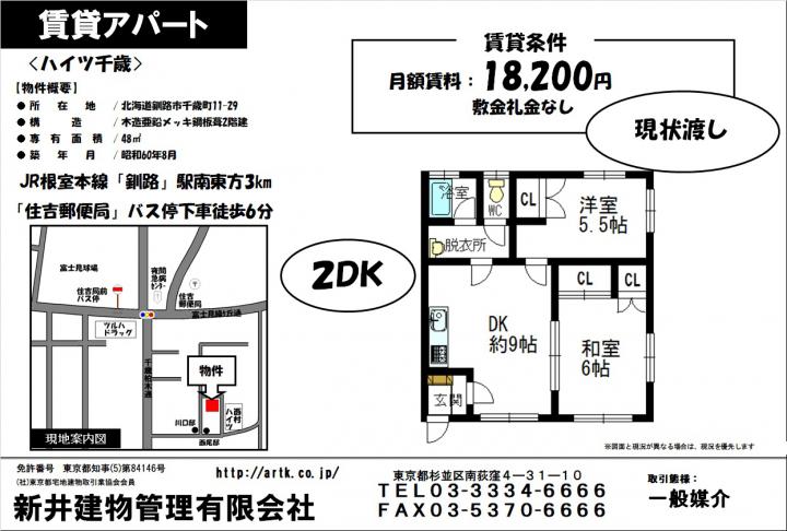 釧路市千歳町11-29 ハイツ千歳 2DK 18,200円 18,200円 / 2 DK JR根室線『釧路』駅 南東方約3km 『住吉郵便局』バス停 徒歩 6分 釧路市千歳町11-29 ハイツ千歳 2DK 18,200円 |