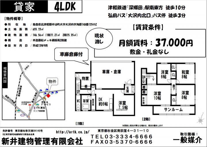 北津軽郡中泊町大字大沢内字海原148番135-2 4LDK 37,000円 37,000円 /管理費等:なし / 4 LDK 津軽鉄道『深郷田』駅 徒歩 10分 弘前バス『大沢内北口』バス停 徒歩 3分 北津軽郡中泊町大字大沢内字海原148番135-2 4LDK 37,000円【設備】車庫・倉庫付 |