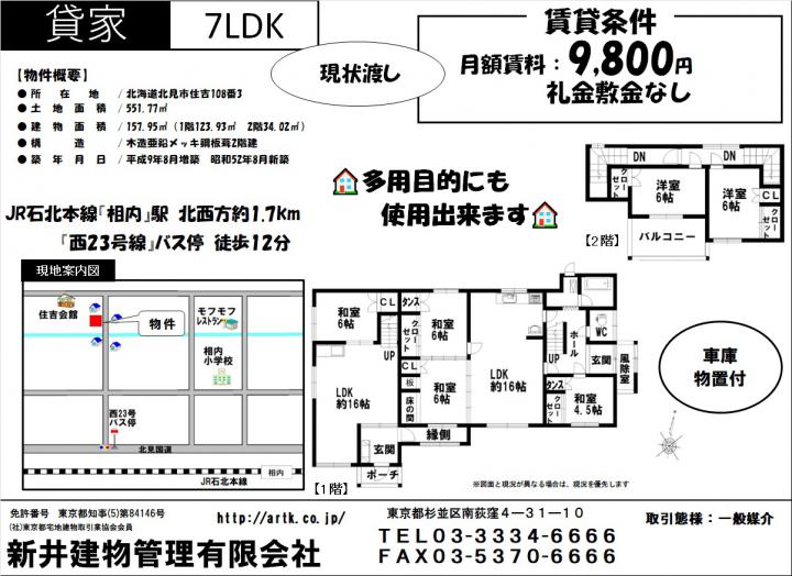 北見市住吉108-3 7LDK 9,800円 9,800円 /管理費等:なし / 5 LDK JR石北本線『相内』駅 北西方約1.7km 『西23号線』バス停 徒歩 12分 北見市住吉108-3 7LDK 9,800円【設備】車庫倉庫つき |