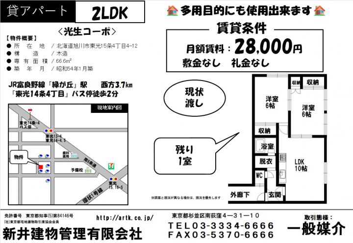旭川市忠和6条5丁目8-28 五月コーポ202 2LDK 28,000円 26,000円 /管理費等:なし / 2 LDK JR函館本線『旭川』駅 東方約5.0km 旭川市忠和6条5丁目8-28 五月コーポ202 2LDK 28,000円 |