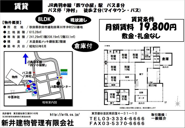 秋田県秋田市雄和田草川字沖村250番地 8LDK 19,800円 19,800円 /管理費等:なし / JR奥羽本線 『四ツ小屋』駅 バス8分 バス停『沖村』 徒歩 2分 秋田県秋田市雄和田草川字沖村250番地 8LDK 19,800円 |