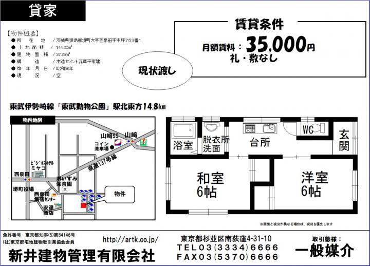 猿島郡境町大字西泉田字中坪753-1 2DK 35,000円 35,000円 /管理費等:なし / 2 DK 東武伊勢崎線「東武動物公園」北東14.8㎞ 猿島郡境町大字西泉田字中坪753-1 2DK 35,000円 |