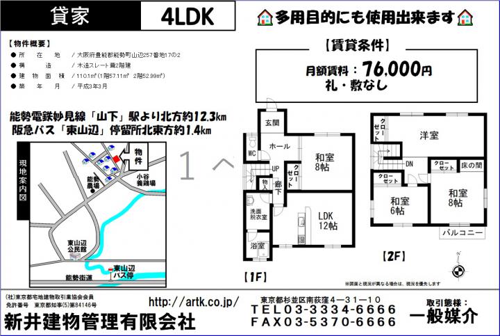 豊能郡能勢町山辺257番地17-2 B棟 4LDK 76,000円 76,000円 / 4 LDK 能勢電鉄妙見線『山下』駅 北方約12.3km 阪急バス『東山辺』バス停 北方約1.4km 豊能郡能勢町山辺257番地17-2 B棟 4LDK 76,000円 |