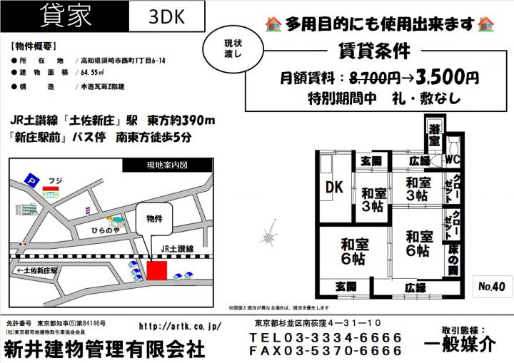 須崎市西町1丁目6-16 西町集合住宅 3DK 3,500円 No,40 3,500円 /管理費等:なし / 4 DK JR土讃線『土佐新庄』駅 東方約390m 徒歩 5分 須崎市西町1丁目6-16 西町集合住宅 3DK 3,500円 No,40 |