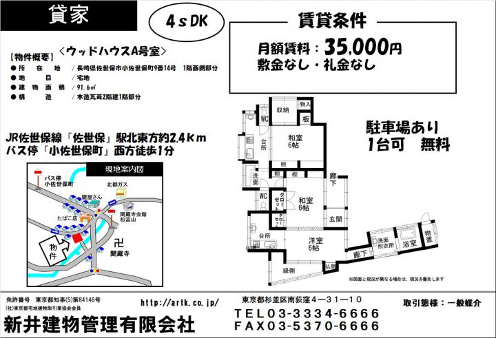 佐世保市小佐世保町9番14号 ウッドハウスA号室 4sDK 35,000円 35,000円 /管理費等:なし / 4 SDK JR佐世保線『佐世保』駅 北東方 約24km 『小佐世保町』バス停 西方 徒歩 1分 佐世保市小佐世保町9番14号 ウッドハウスA号室 4sDK 35,000円 |