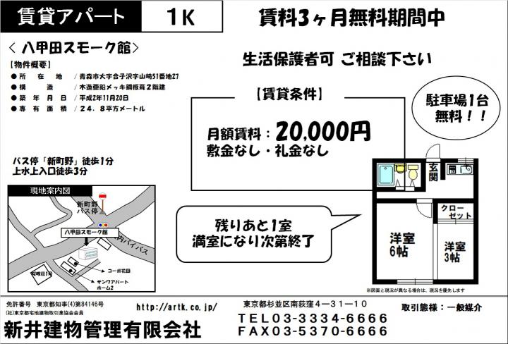 | 物件名 | 青森市大字合子沢字山崎51-27 八甲田スモーク館 1K 20,000円 |
