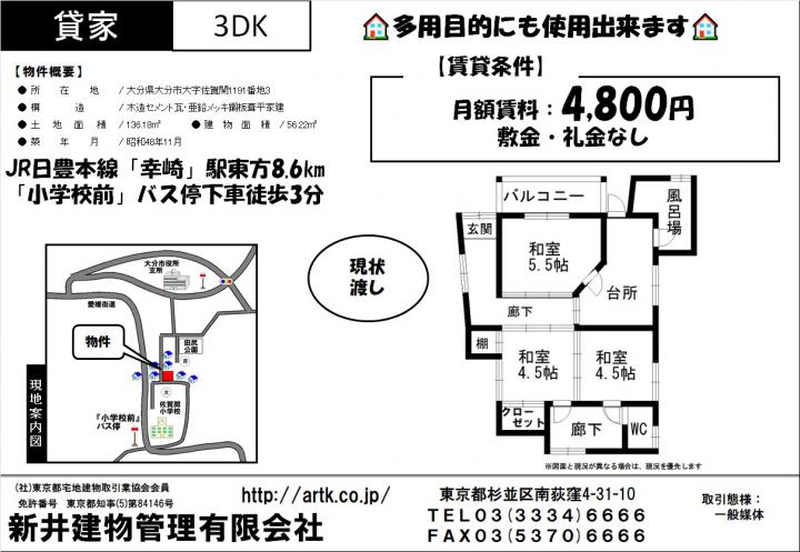 | 物件名 | 大分市大字佐賀関1191-3 3DK 4,800円 |