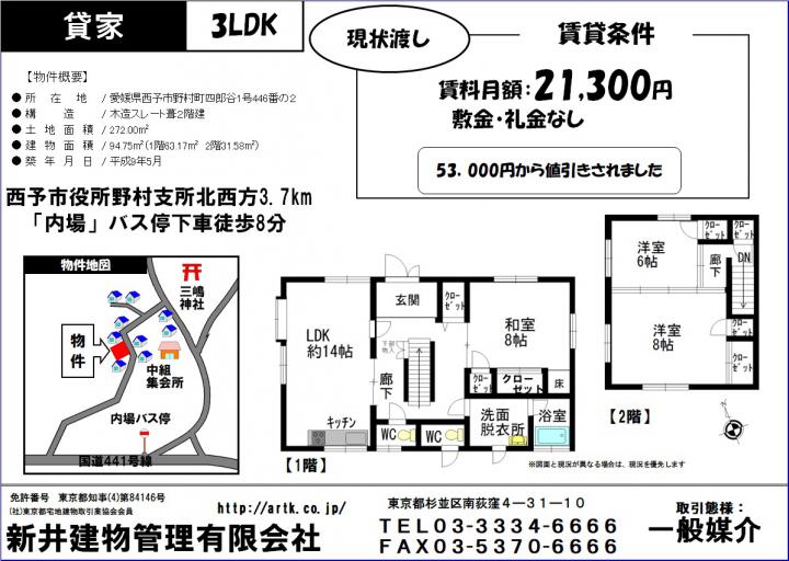 | 物件名 | 西予市野村町四郎谷1号446-2 3LDK 21,300円 |