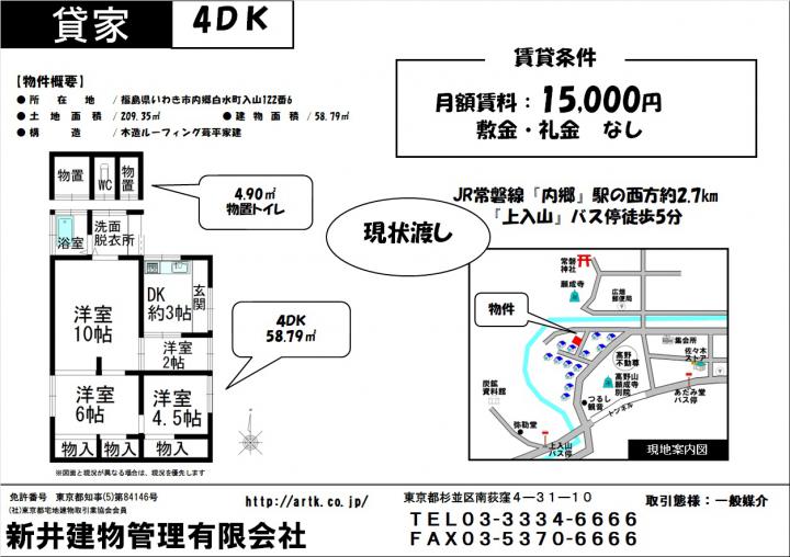JR常磐線『内郷』駅 西方約2.7km | いわき市内郷白水入山122番6 | 4 DK | 58.89㎡ | 1956年09月 | 15,000円 なし | なし なし |
