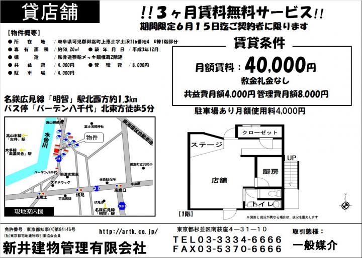 | 物件名 | 可児郡御嵩町上恵土 D棟1F 貸店舗 40,000円 |