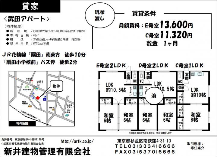 | 物件名 | 大館市比内町扇田 武田アパートE 2LDK13,600円 |
