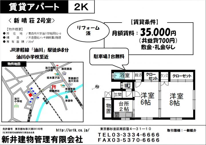 【賃貸物件】青森市大字油川字船岡52-9 新晴荘5号室 2K 35,000円 (アパート)|JR津軽線『油川』駅 |新井建物管理|全国の不動産、収益物件、中古住宅、賃貸・売買物件