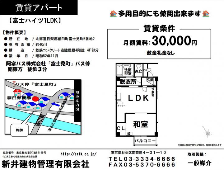 【賃貸物件】目梨郡羅臼町富士見町5番地2 富士ハイツ 1LDK 30,000円(アパート)|『富士見町』南東方 徒歩3分|新井建物管理|全国の不動産、収益物件、中古住宅、賃貸・売買物件