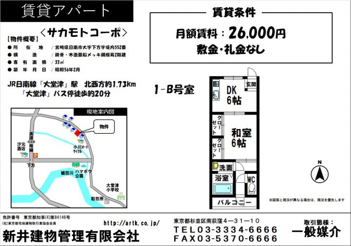 | 物件名 | 日南市大字下方552番地 サカモトコーポ1DK 1-B 26,000円 |