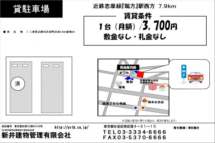 | 物件名 | 【貸駐車場】志摩市浜島町浜島1330-34 3,700円 |