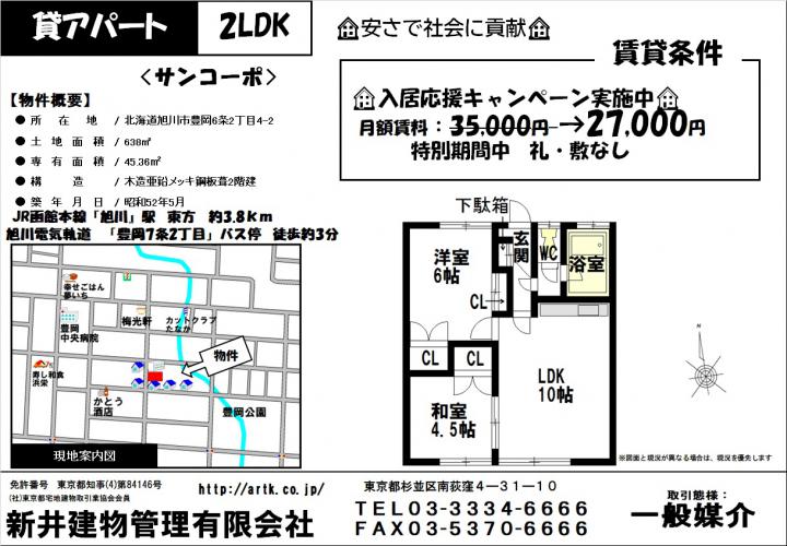 | 物件名 | 旭川市豊岡6条2丁目4-2サンコーポ 2LDK 27,000円 |