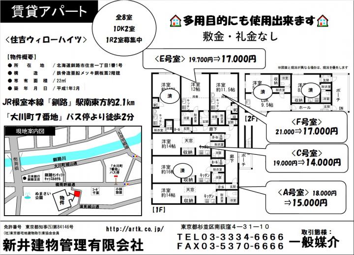 【賃貸物件】釧路市住吉1丁目1番1号 ウィローハイツE号室 17,000円(アパート)|JR根室本線『釧路』駅 南東方約2㎞|新井建物管理|全国の不動産、収益物件、中古住宅、賃貸・売買物件