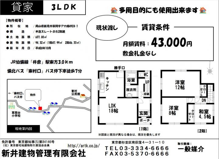 | 物件名 | 新見市草間字アカ畑4924-1 3LDK 38,100円 |